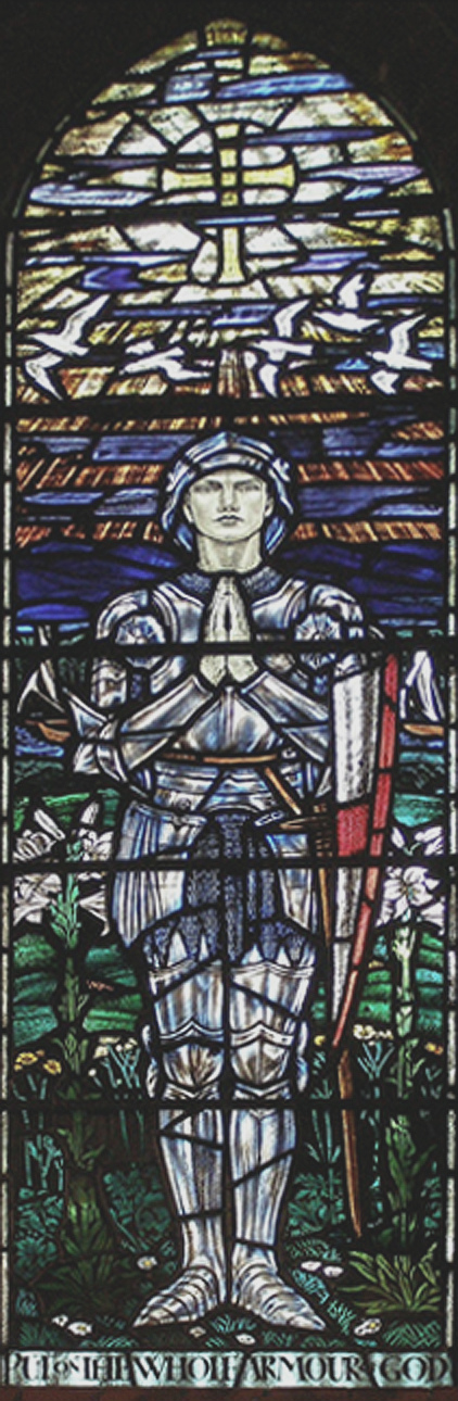 In St Hildeburgh’s Church at Hoylake is a lovely war memorial window by Margaret. It shows a medieval knight holding a shield with a red cross. Behind the figure are lilies, and boats crossing a seascape. Above are doves, and below an inscription, ‘Put on the whole armour of God’.