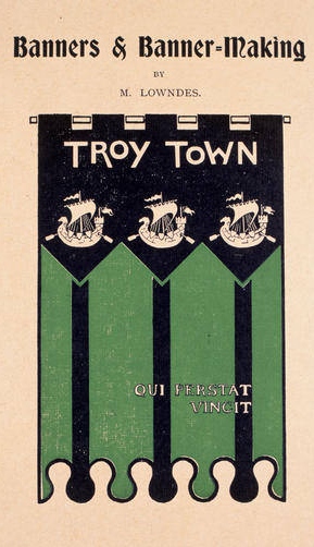# The Suffrage Banners Collection at the Women’s Library in London houses an album of Mary Lowndes’ original banner designs including fabric swatches.