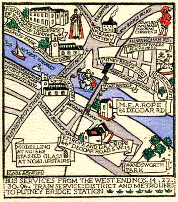 However, Ellen Mary, Dorothy and Tor did not stay to watch Chelsea FC’s ascendancy. Soon after Marga left 404c, so did they (though not far), to go south of the river to Deodar Road. A quaint little map, designed by Clare Dawson (a stained-glass artist friend to both Tor and Marga), shows their new addresses.