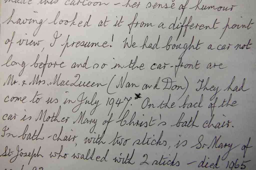 In this post though, we are moving on, to take a look at the three humorous pen-and-ink drawings in the collection. The first two sketches in the collection, which we discussed last time, show a waspish attitude, but – by complete contrast – these three fun sketches show a gentle, benevolent sense of humour about life in the convent. (She was a nun in an ‘enclosed’ order of Carmelites from 1923 to her death in 1953).