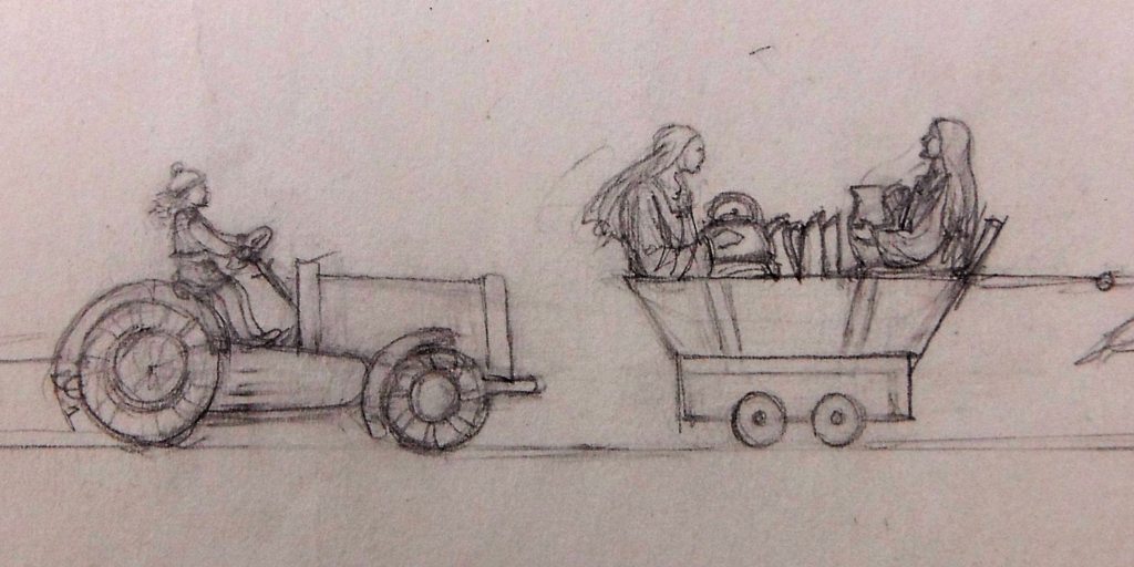 One sister is tossed upside down in her wheelchair (by a pothole presumably!); a little girl (the daughter of the community’s handyman) drives her toy car; two nuns in a trailer carry a kettle, jugs, plates (this poor community’s worldly goods); and even the nun’s henhouse is featured – nearly all drawn along by some unlikely oxen!