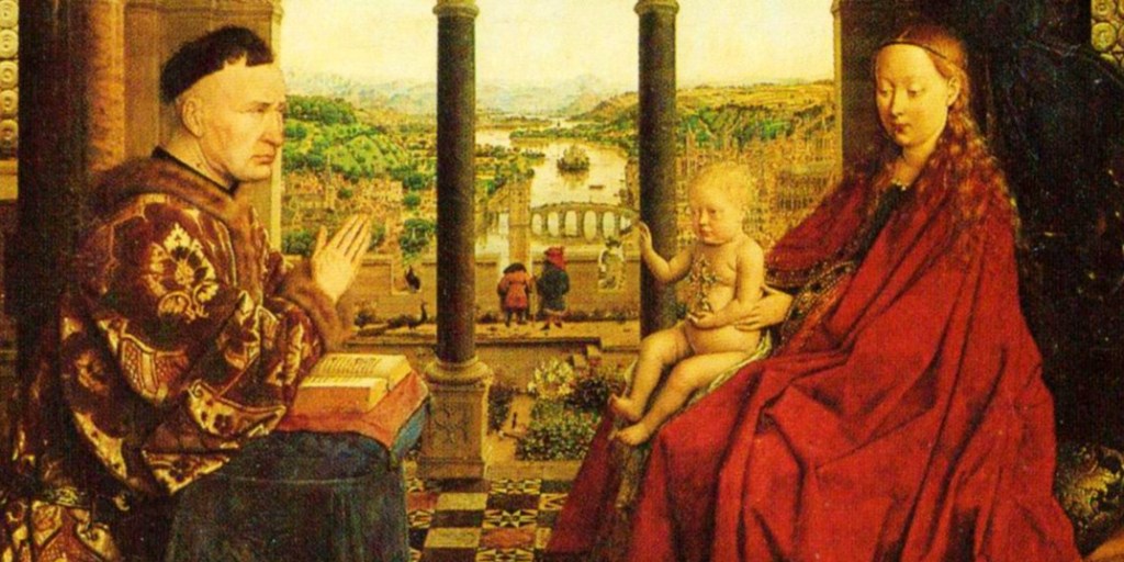 However, all too soon, the more arrogant donors couldn’t resist having themselves feature larger and larger – until by the late fifteenth century, the donor can be life-size. The Virgin & Child by van Eyck is the supreme example of this (see pic below).
