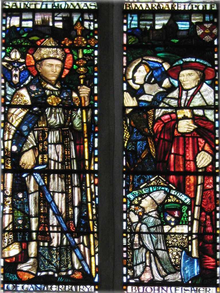 And, in Marga’s west window, we see this. The central standing figure is Bishop St Thomas Of Canterbury (see pic right) – who has Canon Moriarty’s features!
