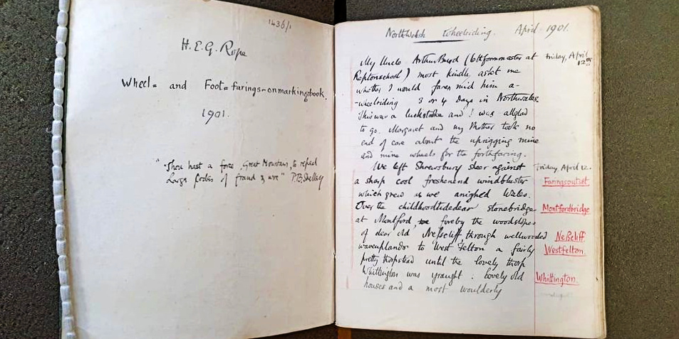 Now and again, but more frequently than one might suppose, something amazing pops up. That is the case with a twenty-page document which has just been rediscovered in the Shrewsbury Archives – the Diary of a 1901 Cycling-Tour, written by Harry Rope (the brother of Margaret Rope), when he was a young man of twenty-one years old.