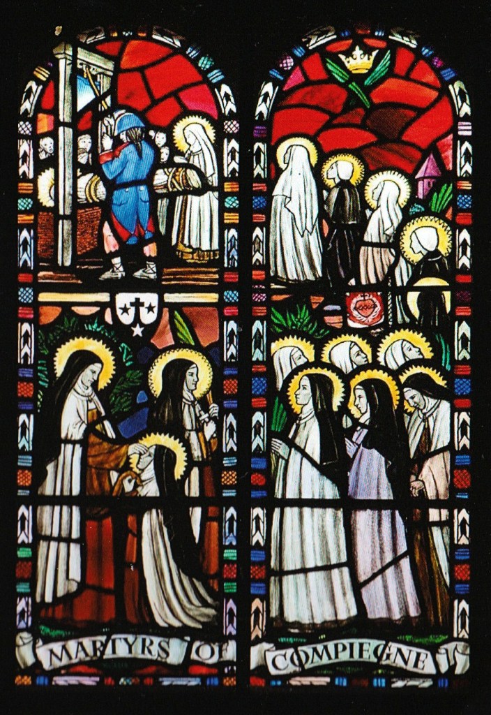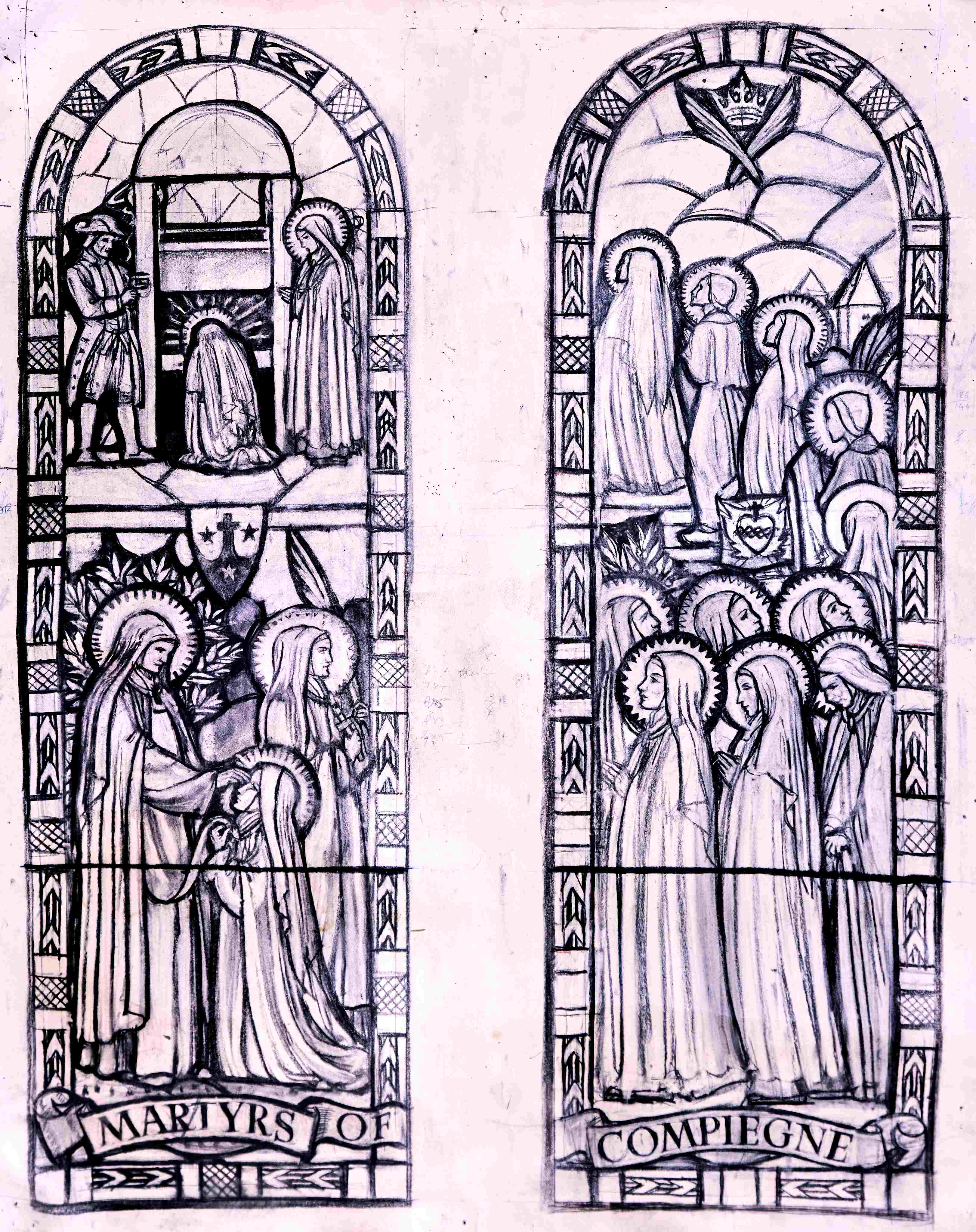 Among these designs are two versions by Marga for the top-left panel of the clerestory’s ‘Martyrs of Compiegne’ window . (The Compiegne martyrs were a number of Carmelite nuns who were condemned to the guillotine, victims of the French Revolution).