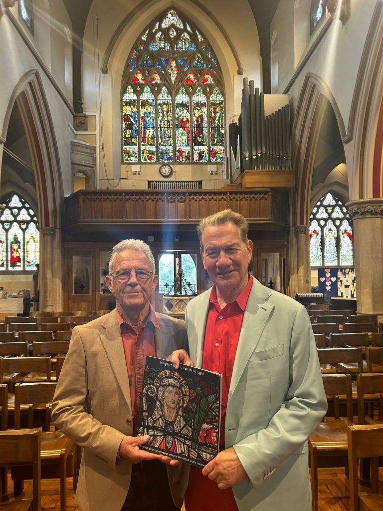 Arthur and Michael with a copy of Arthur’s book, and with Marga’s Great West Window behind them