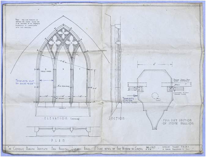 By piecing together artefacts within the Archives – preliminary sketches and drafts, contemporary photos and on-the-ground evidence -, the team can build up a good idea of the appearance of a lost window, even to the point of knowing what size it was.